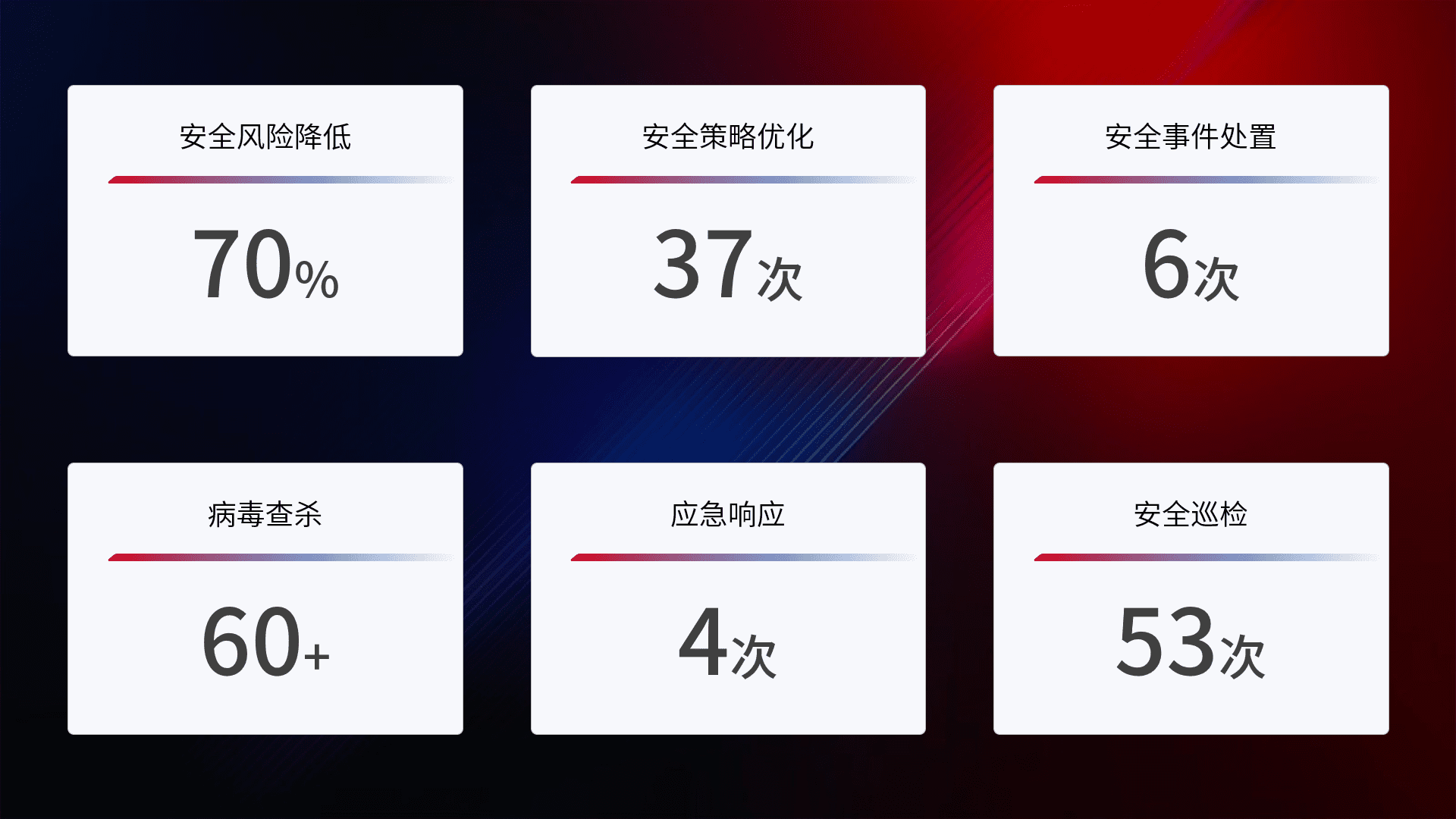 提供全面的安全事件报告体系,,包括处置报告、、、、周报、、、季度和年度总结,,,,结合持续监控,,,,帮助客户深入了解网络安全状况。。。
