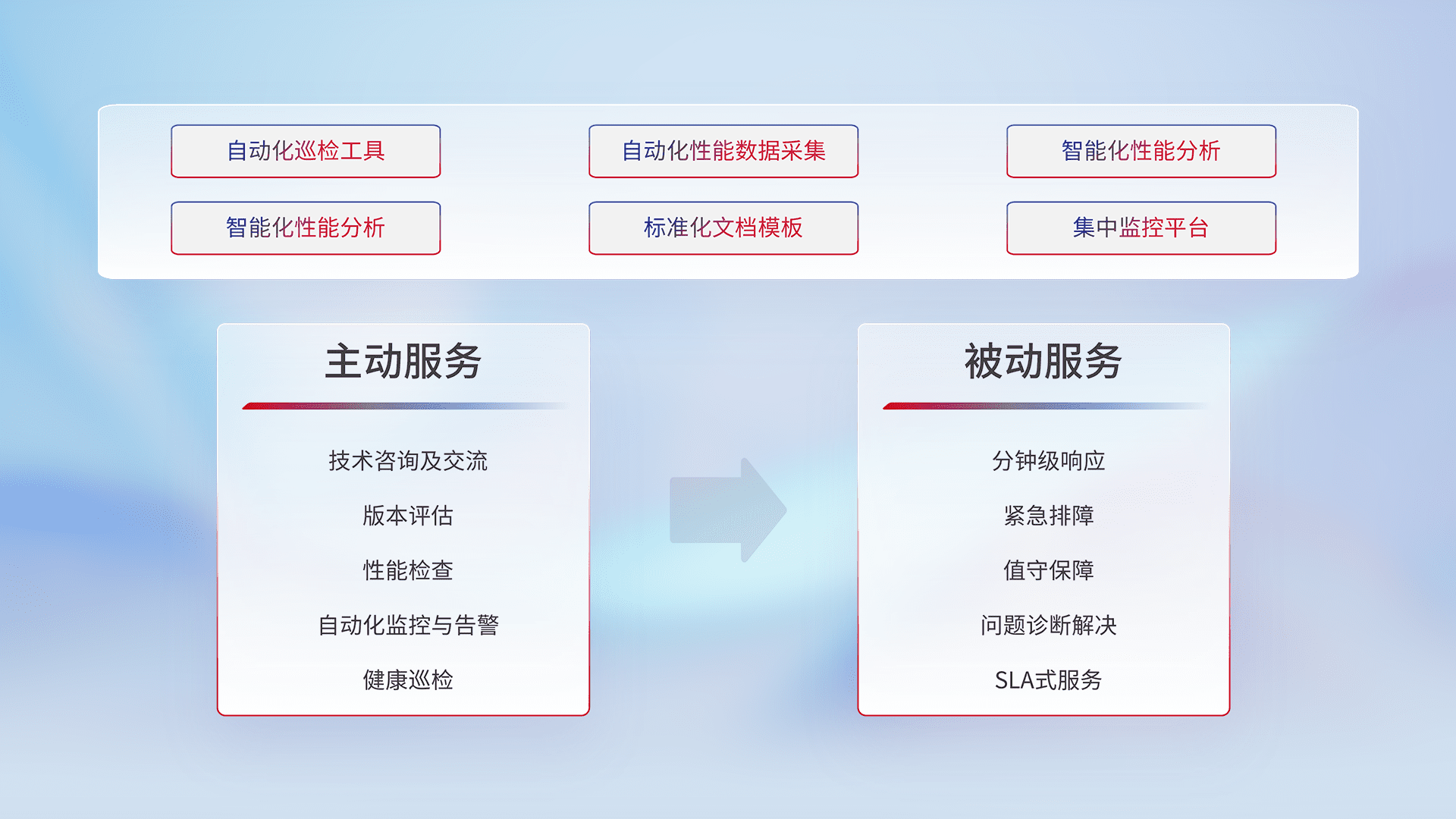 智能化工具和标准化文档,,,,保障服务质量,,提供主动服务(包含技术咨询、、版本评估、、性能检查、、、自动化监控与告警、、、、健康巡检)和被动服务包含(分钟级响应、、、紧急排障、、、、值守保障、、、、问题诊断解决、、SLA服务)。。。